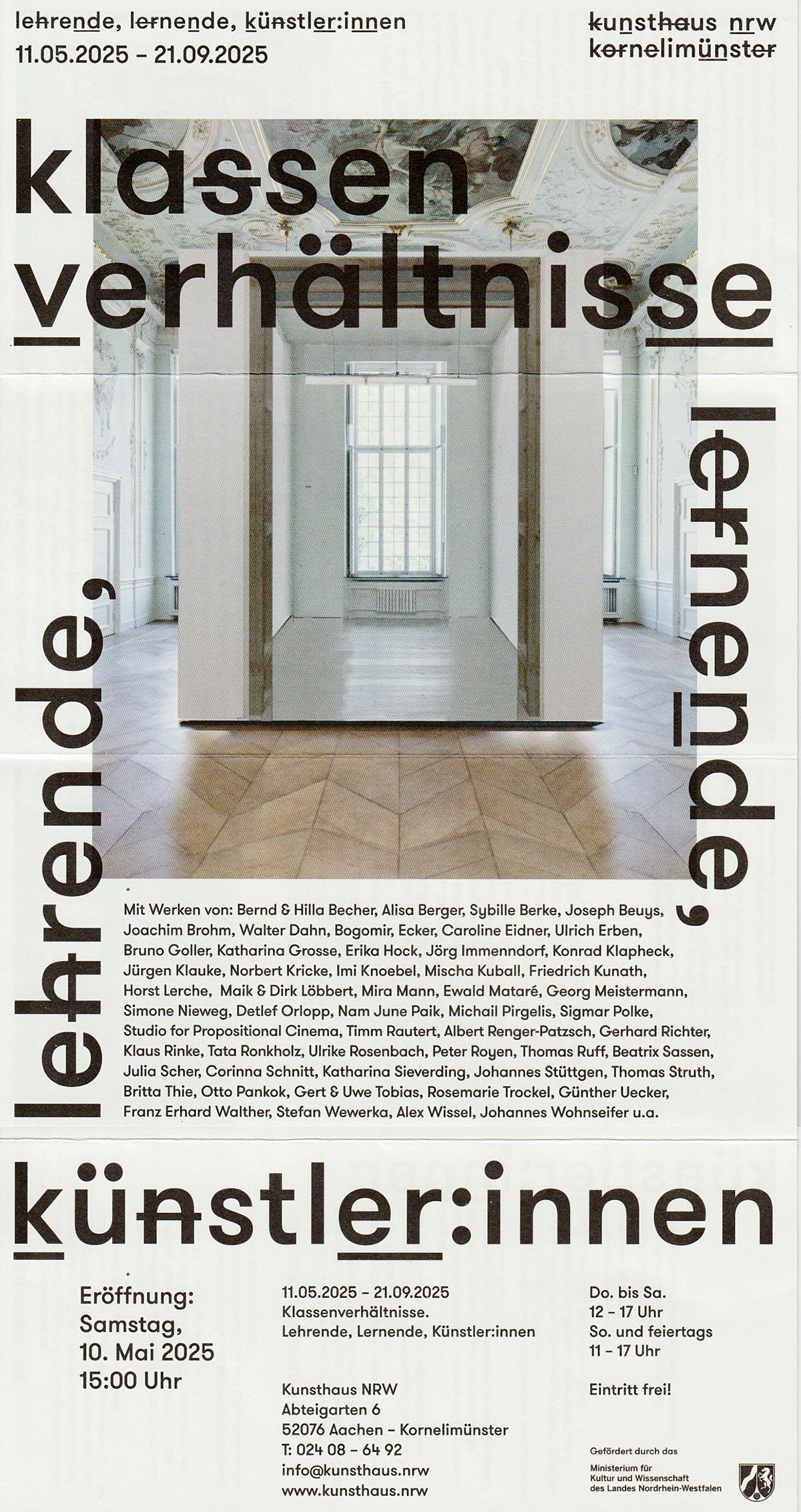 Teilnehmende Künstler*innen: Massimo Bartolini (IT), Brent Birnbaum (US), Jan Bräumer (DE), Lars Breuer (DE), Marcel Broodthaers (BE), Michael Conrads (DE), FORT (DE), Daniela Friebel (DE), Philipp Goldbach (DE), Candida Höfer (DE), Christian Jankowski (DE), Howard Kanovitz (US), Maik und Dirk Löbbert (DE), Paul McCarthy (US), Stephan Reusse (DE), Claus Richter (DE), Patrick Rieve (DE), David Shrigley (GB), Wolfgang Stehle (DE), Sebastian Tröger (DE), Ben Vautier (FR), Johannes Wohnseifer (DE) sowie Dokumentationen temporärer Werke von: Michael Asher (US), VALIE EXPORT (AT), Haus-Rucker-Co (AT/DE), Yves Klein (FR), Allen Ruppersberg (US), Jean Tinguely (FR)